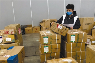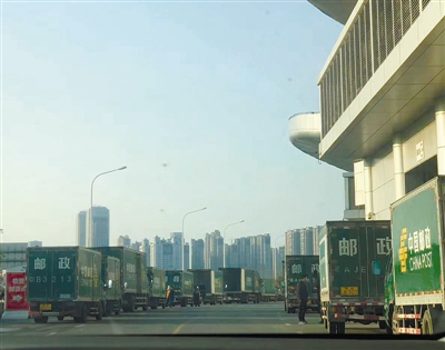 | 汉阳国博中心仓库门口,通过邮政快递来的爱心捐赠物资一眼望不到边。 |