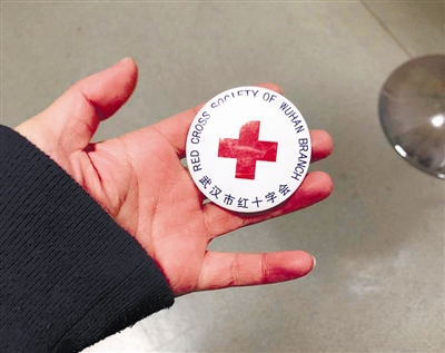 | 李林澎领到代表人道救助的武汉市红十字会徽标。 |