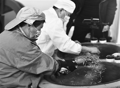 2月23日,武义汤记茶业公司员工边忙着手工炒制新茶,边在淘宝网现场直播售卖。