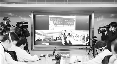 2月21日晚7时,在浙大二院解放路院区行政楼9楼会议室、武汉协和肿瘤中心、浙大二院援汉医疗队前线指挥中心,三方远程会诊开始,一位47岁的新冠肺炎患者病情恶化,前后方紧急讨论诊疗方案。