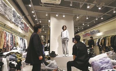 | “前沿”女装员工正在向线上客户直播服装款式,来自衢州的店员小徐说:“虽然受疫情影响,销量大打折扣,但一直在尝试多种销售方式,我们信心满满。” |
