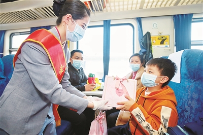 3月6日,成品从四面八方汇集到列车上,芒果千层、戚风蛋糕、核桃酥……现场香飘四溢,让人垂涎三尺。在每一份爱心礼盒上,亲情服务团队的女职工还亲手书写了小便条——“正是江南好风景,一片冰心杭客情”“桃之夭夭,灼灼其华,杭客巾帼,蕙质兰心”……祝福的话语、可口的点心更增添了一份温暖。除了坚守在一线的乘务人员,60岁以上的老人和小朋友们也都分享到了这份暖心的祝福。