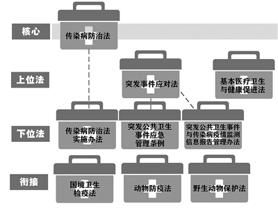 目前,我国已经初步建立了以《传染病防治法》为核心、以《突发事件应对法》《基本医疗卫生与健康促进法》等为上位法、以《传染病防治法实施办法》《突发公共卫生事件应急管理条例》《突发公共卫生事件与传染病疫情监测信息报告管理办法》等为下位法、以《国境卫生检疫法》《动物防疫法》《野生动物保护法》等为衔接的三个层次的立体性防控法律体系,对预防、控制、消除传染病的发生、传播和流行发挥了至关重要的作用,其成绩应予肯定。