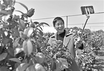 | 花农在茶园直播卖茶花。 吴潮宏 摄 |