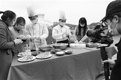 3月14日,在绍兴市柯桥区兜率天景区,正在现场直播游客体验制作艾饺等传统民俗活动。当地借助“云踏青”推介柯桥旅游,旨在吸引更多游客前来欣赏美景、品尝美食。