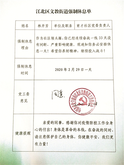 “感谢你对疫情防控工作全身心的付出!身体是革命的本钱,在奋战的同时,请注意保护自己的身体,你健康平安,我们更有力量!”2月底,江北区文教街道育才社区党委负责人林开芳意外地收到了街道开出的“强制休息单”。