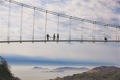 3月22日,在温岭市松门镇大坑沙旅游休闲项目建设工地上,建筑工人正在安装悬空玻璃索桥防护绳。