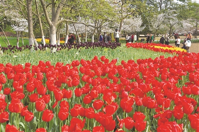 近日,随着气温回升,杭州市西湖风景区太子湾公园的郁金香、玉兰花、樱花等竞相绽放,吸引了不少游客前来踏春赏花。图为游客在太子湾公园游玩拍照。