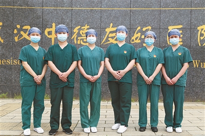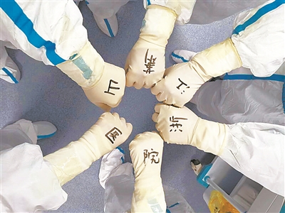 穿上防护服进病房前,6人团队有个不成文的约定,互相帮同伴在防护服上写上各自的名字、单位,和“武汉加油”几个字,然后再拗个造型拍个照,彼此鼓励打气。