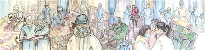 收集素材、勾勒轮廓、描摹上色……短短10天,一幅惟妙惟肖的作品诞生。“我按照纪念性壁画的构图方式构建我的画面,虽然它的尺幅没有壁画那么大,但是它可以连续地讲述不同场景的故事情节,将所有的情节连成一曲完整的赞歌。”一帧帧画面诉说着一个个栩栩如生的故事,“病情危急、全力救治、精心护理、研讨病情、关心关爱……”所有的人物、所有的场景均取材于衢州市人民医院抗疫一线的医护人员。徐莉 凌燕