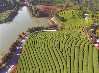 4月7日,空中俯瞰武义县更香、郁青香、石鹅湖等茶园,茶农在层层叠叠、山水镶嵌的园中采茶,宛如画中游。