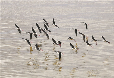 近日,在玉环市鸡山岛港湾内,一群腿部修长呈深红,嘴、额、翅膀呈黑色,腹部为白色的鸟,一会儿飞掠在海面,一会儿站在海滩上。渔民老陈说,这些鸟逗留在此有好几天了。