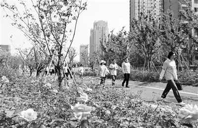 | 市民毅行在花红柳绿的公园里。 记者邹伟锋 摄 |