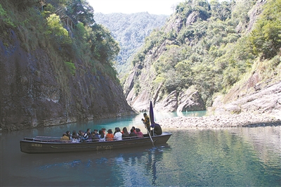 第二站是石桅岩景区,石桅岩景区的特点符合六字方针:雄、奇、险、秀、幽、奥。景区的一段路可以爬山,也可以坐船,这样就适合游客有所选择,既能看山,又能坐船看两岸的风光。船行驶在水面上,有种游览长江三峡的感觉,只是时间比较短,大概只需20分钟的水路。
