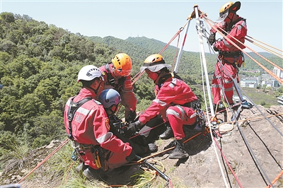 昨日上午,一场救援演练在杭州市西湖区留下街道美人峰进行,现场模拟有一名驴友在攀岩时被困悬崖山谷,西湖区应急管理局接警后,迅速组织专业救援队伍赶往“救援”。10分钟后,经过专业救援队员采用绳索救援技术将驴友成功“救出”……