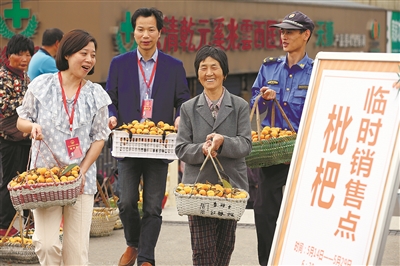 图为乾元镇人大代表和行政执法工作人员帮助64岁果农周彩娥(前排右一)将枇杷搬到“临时销售点”。