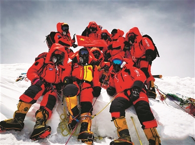 5月27日,2020珠峰高程测量登山队在峰顶合影留念。