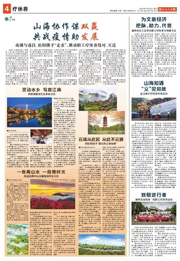 本报讯 记者潘仙德、王艳报道 今年,省文化和旅游厅、省总工会印发《关于鼓励开展职工疗休养活动促进文化和旅游产业发展的通知》,鼓励各市、县(市、区)大力开展疗休养结对和互送活动,助力城乡融合、山海协作;鼓励文化和旅游部门与工会加强合作,开发形式多样、内容丰富和符合政策的路线和产品,更好地满足职工多样化疗休养需求。