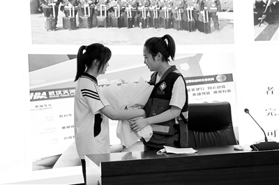 图为报告结束后学生代表向马燕琴(右)送上鲜花,表达敬意。