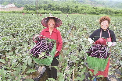 6月9日,在建德市三都镇的增喜家庭农场里,菜农们正忙着采收露天栽种的茄子等当季蔬菜,并在田头进行分拣包装,装车后立即直送城镇市场,让市民能够买到最新鲜的时令蔬菜。