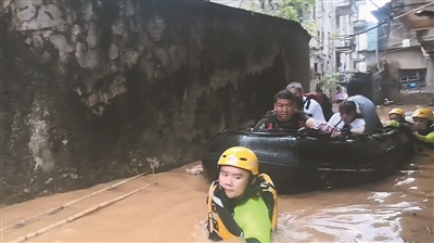 6月30日,衢州出现大暴雨天气,局部地区出现特大暴雨,多地出现险情。衢州市消防救援支队组织调度各地消防救援力量赶赴现场转移被困群众。截至6月30日21时许,共营救疏散群众138人。图为常山县天马街道桃园小区不少居民被困家中,消防员将小孩和行动不便的老人迅速转移到安全区域。
