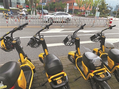 | 街头缺失头盔的共享电单车。 |