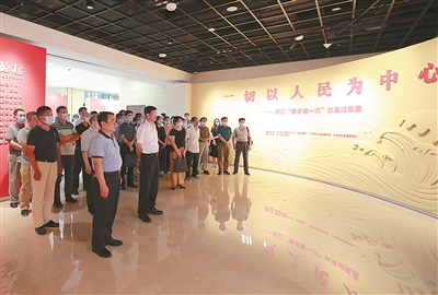 | 全体党员干部参观“一切以人民为中心——浙江‘最多跑一次’改革成果展”。 |