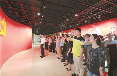 | 全体党员干部在省档案馆二楼大厅的党旗前重温入党誓词。 |