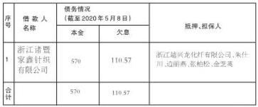 | 单位:人民币万元 注:1. 清单中“担保人”包括保证人、抵押人、出质人,担保人的担保范围以签署的合同等法律文件约定为准。如公告中债务人、合同编号、债权金额、担保人等信息与事实不符的,以签署的合同等法律文件约定为准。 2. 本公告清单列示截至2020年5月8日的贷款本金余额,借款人和担保人应支付给浙江省浙商资产管理有限公司的利息、罚息、违约金及其它应付款按借款合同、担保合同及中国人民银行的有关规定或生效法律文书确定的方法计算,实际计算与欠息金额不一致,以实际计算为准。已经进入诉讼程序的,并已由浙江省浙商资产管理有限公司垫付的应由借款人及担保人负担的诉讼费、执行费等以有关法律文书确定的金额为准。 3. 若借款人、担保人因各种原因更名、改制、歇业、吊销营业执照或丧失民事主体资格的,请相关承债主体及/或主管部门代位履行义务或履行清算责任。 |