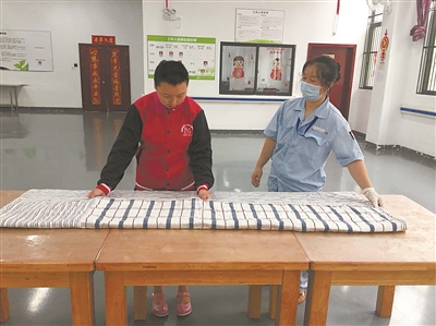 | 班组护理员阿姨耐心细致地教香香如何折叠衣服。 |