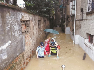 | 建德市政法工会新安义警队员廖志军、辅警邓献斌将被困老人背出危险区域。 |