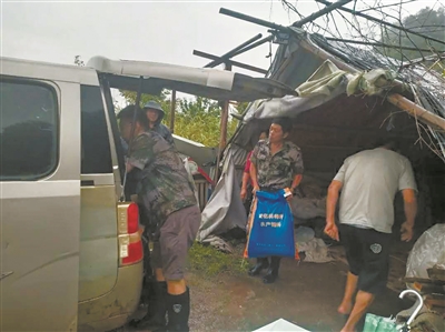 | 建德市梅城镇总工会副主席许浩(前左一)赶在泄洪之前,帮助农户转运生产物资。 |