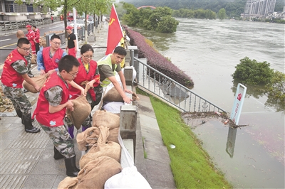 | 昨日上午9时,新安江水库开启9孔泄洪,致使大坝下游水位进一步升高。当日一早,建德市新安江街道700多名党员干部及志愿者坚守岗位,全力投入到新安江畔江滨公园罗桐埠段城防工程抗洪抢险战斗中,对200多米江堤采用沙袋筑堤加固,防御上涨洪水漫过堤岸倒灌,确保临江居民生命安全。 通讯员宁文武 摄 |