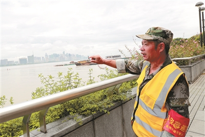 | 在滨江码头江堤上,长河街道平安巡访员向记者比划江水上涨水位。 |