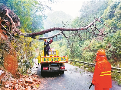 受持续强降雨影响,造成土石疏松。7月8日上午9时左右,开化县县道转大线4k+610米地段上边坡一棵根径20多厘米、10余米长的松树突然倾倒,正好压在公路上方的电缆线上,情况十分危急。开化县池淮公路站接到报告后,立即调集人员上路紧急排险。由于此处边坡地势十分陡峭,人一时上不去。于是,该站果断安排养护人员站在工具车的车斗里,用油锯将松树锯成几段,随后逐一将树木清除出路面。经过养护人员连续半个多小时的冒雨抢险,及时排除了险情,使该路段恢复了交通。