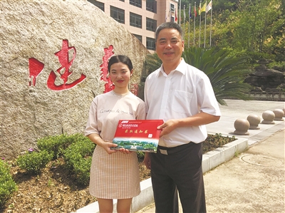 | 周潇颖(左)收到了浙江旅游职业学院副院长王忠林送上的录取知通书。 记者杜成敏 摄 |