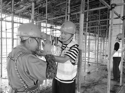 “安全帽能避免头部磕碰及被落物击伤,能有效保护头部安全,所以进入工地必须戴上,而且要戴正确。”日前,海盐县武原街道的专职网格员在走访辖区一建筑工地时,发现有工人没按规定戴好安全帽,专职网格员进行耐心讲解和演示,提醒工人正确佩戴安全帽。通讯员沈晖 摄