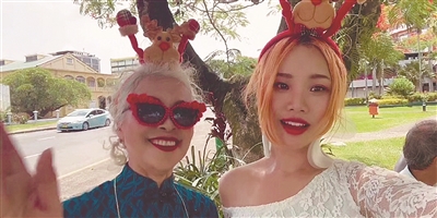 | 2019年12月25日,何大令和66岁的时尚奶奶高建华在斐济。 |