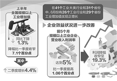 上半年,全国规模以上工业增加值同比下降1.3%,降幅比一季度收窄7.1个百分点,其中二季度增长4.4%,产销形势好转。在41个工业大类行业和31个省份中,6月份有26个工业行业和29个省份工业增加值实现正增长。企业效益状况进一步改善,前5个月规模以上工业企业营业收入利润率达到5%,比一季度提高1.06个百分点,利润降幅收窄至19.3%,5月份当月增长6%。