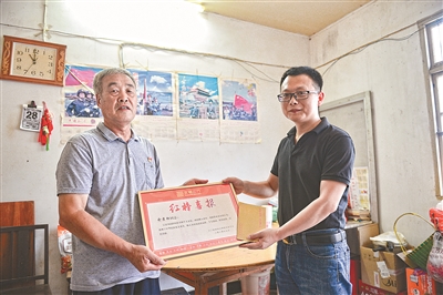 7月28日上午,三门县文明办、三门县公安局治安大队工作人员上门将《见义勇为行为确认证书》《红榜喜报》送到两度跳入水库、先后救起落水母女的平民英雄俞景相老人手上,以表彰他路见危难挺身相救的壮举。