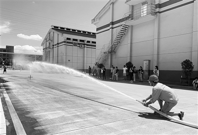 随着裁判长的哨声响起,三名粮管职工如离弦之箭般,拿着消防设备跑向着火点。随着消防阀门的打开,一条白色长龙喷涌而出,火势顺利扑灭,引得现场掌声雷动,欢呼阵阵。