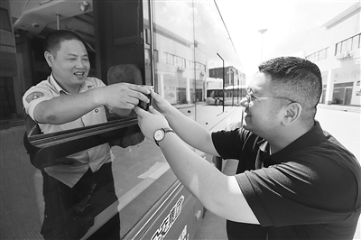 | 工会主席高琦(右)为正在准备发车的驾驶员送上酸梅汤,并叮嘱安全行车。通讯员董美巧 摄 |