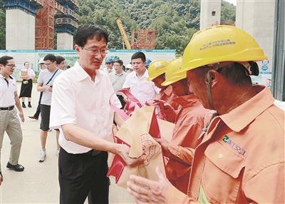 | 张才方向一线交通建设者送上高温慰问品。 记者邹伟锋 摄 |