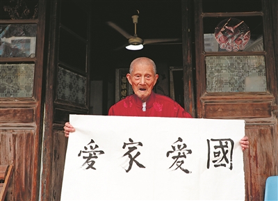 老人平时喜欢看电视,关心国内外大事,还喜欢看书。老人毛笔字写得不错,经常有人上门求字。当着笔者的面,老人家写下“爱家爱国”,苍劲有力,让人动容。