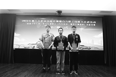 | 嘉职院推送的两名选手(中、右)分获汽车技术赛项第一、三名。 |