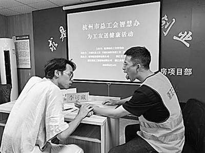 日前,由杭州市总工会智慧办主办,下城区总工会、下城区城投集团、桐君堂中医门诊部承办的“凝心聚力谋建设,关爱民工促发展”的义诊活动,在长浜路2号,省三建建设集团施工的17、19商务用房项目工地开展。