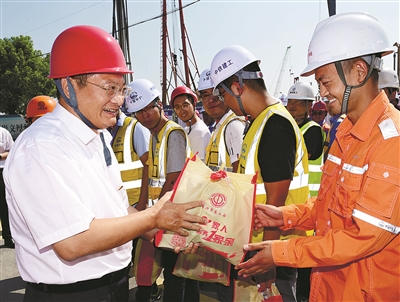 本报讯 通讯员盛建生摄影报道 进入末伏,禾城气温仍节节攀高,全市广大劳动者冒酷暑、战高温,坚守工作岗位,加快各项工程建设进度,确保城市安全有序运行。带着对他们的敬意和问候,连日来,嘉兴四套班子领导张兵、毛宏芳、刘冬生、高玲慧等在市总工会等部门负责人陪同下,看望慰问坚守一线的各行各业职工,送去党和政府的关怀。