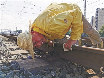 | 老牛跪在滚烫的铁轨上进行安全检查。 记者胡翀 摄 |