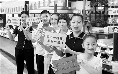 | 位于武义县东南工业区的南唐食府农家乐,每天有300多名企业职工在此就餐。图为农家乐员工与就餐客人手举提示牌,承诺杜绝浪费从我做起。通讯员张建成 摄 |