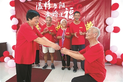 七夕节前夕,德清县乾元镇东郊社区居家养老服务照料中心,热闹非凡,15对金婚夫妇参加的“婚礼”正在这里进行着。